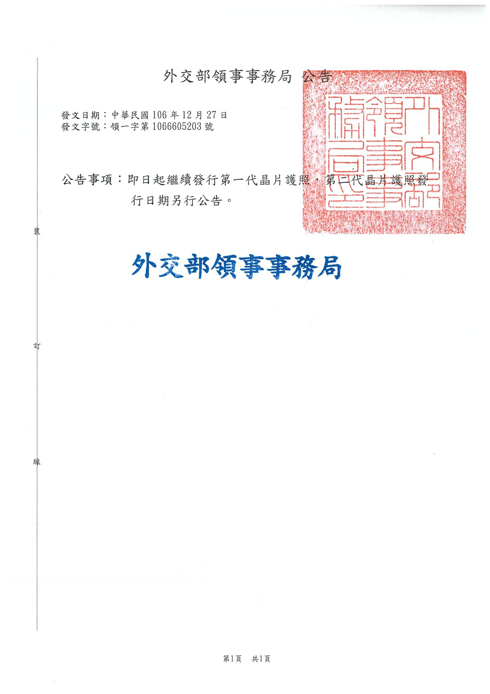 即日起繼續發行第一代晶片護照,第二代晶片護照發行日期另行公告。