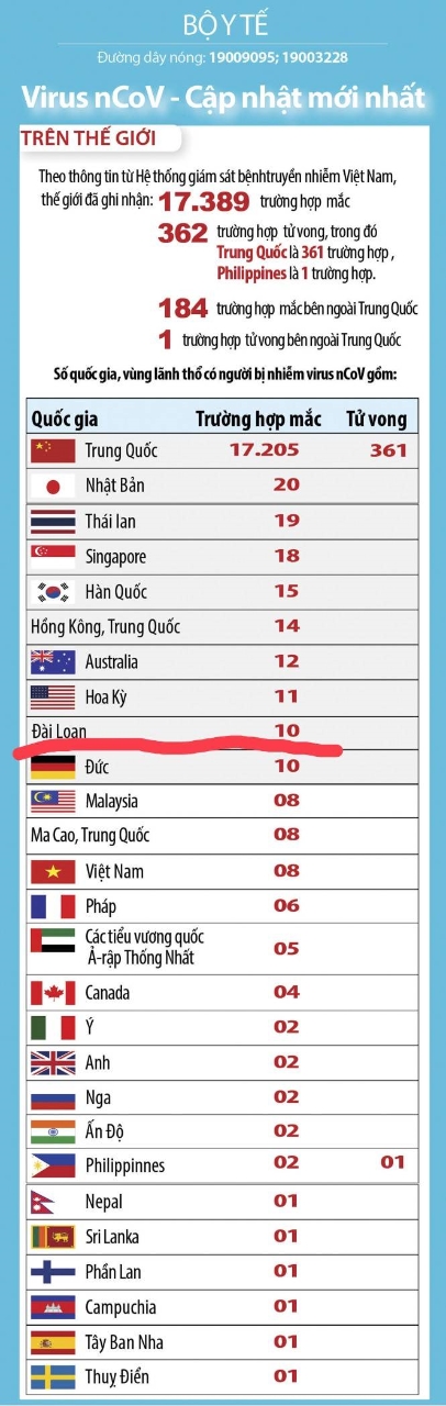 Bảng thống kê tình hình ca nhiễm nCoV hàng ngày của Bộ Y tế Việt Nam công bố, trên đó tách riêng Trung Quốc và Đài Loan thành hai khu vực khác nhau. Điều này cho thấy, Chính phủ Việt Nam nhận định Đài Loan không nằm trong vùng dịch của Trung Quốc.