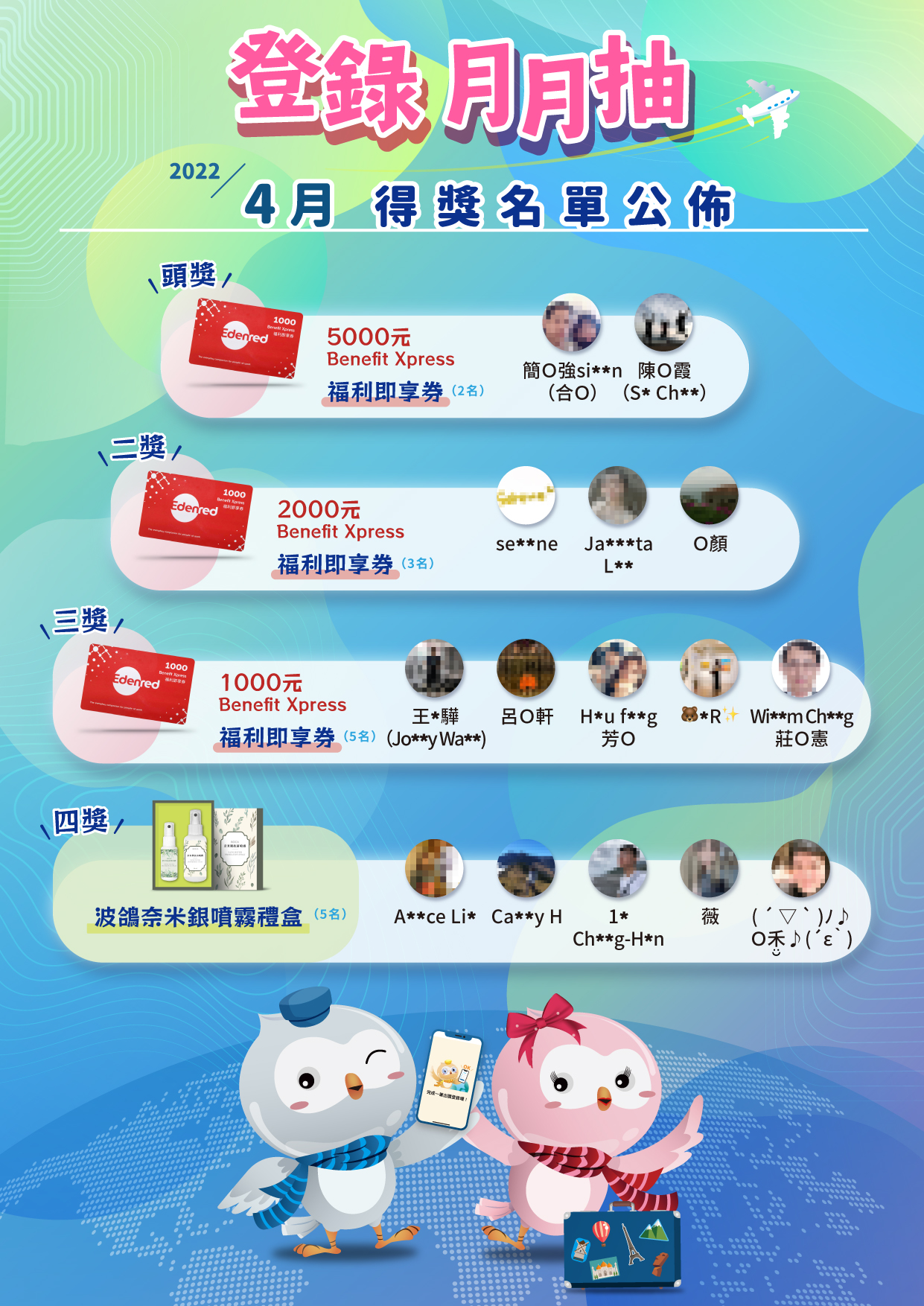 外交部領事事務局「出國登錄月月抽」抽獎活動111年4月得獎名單