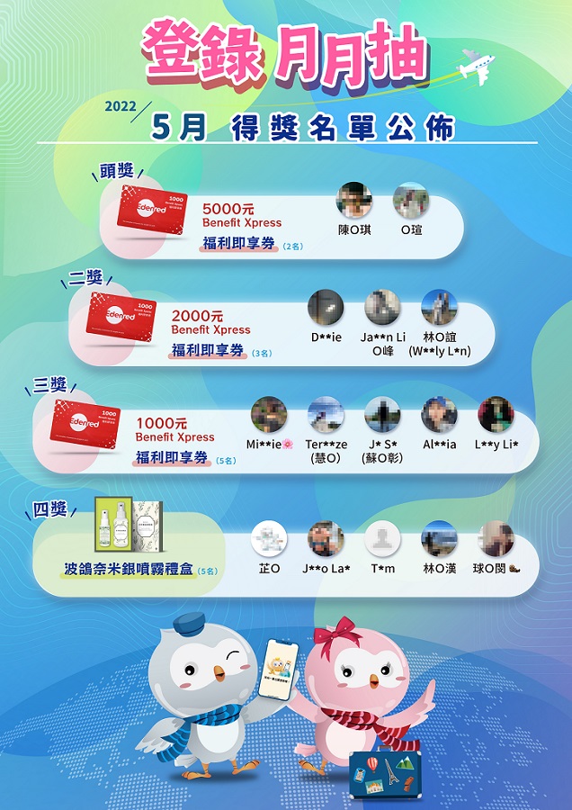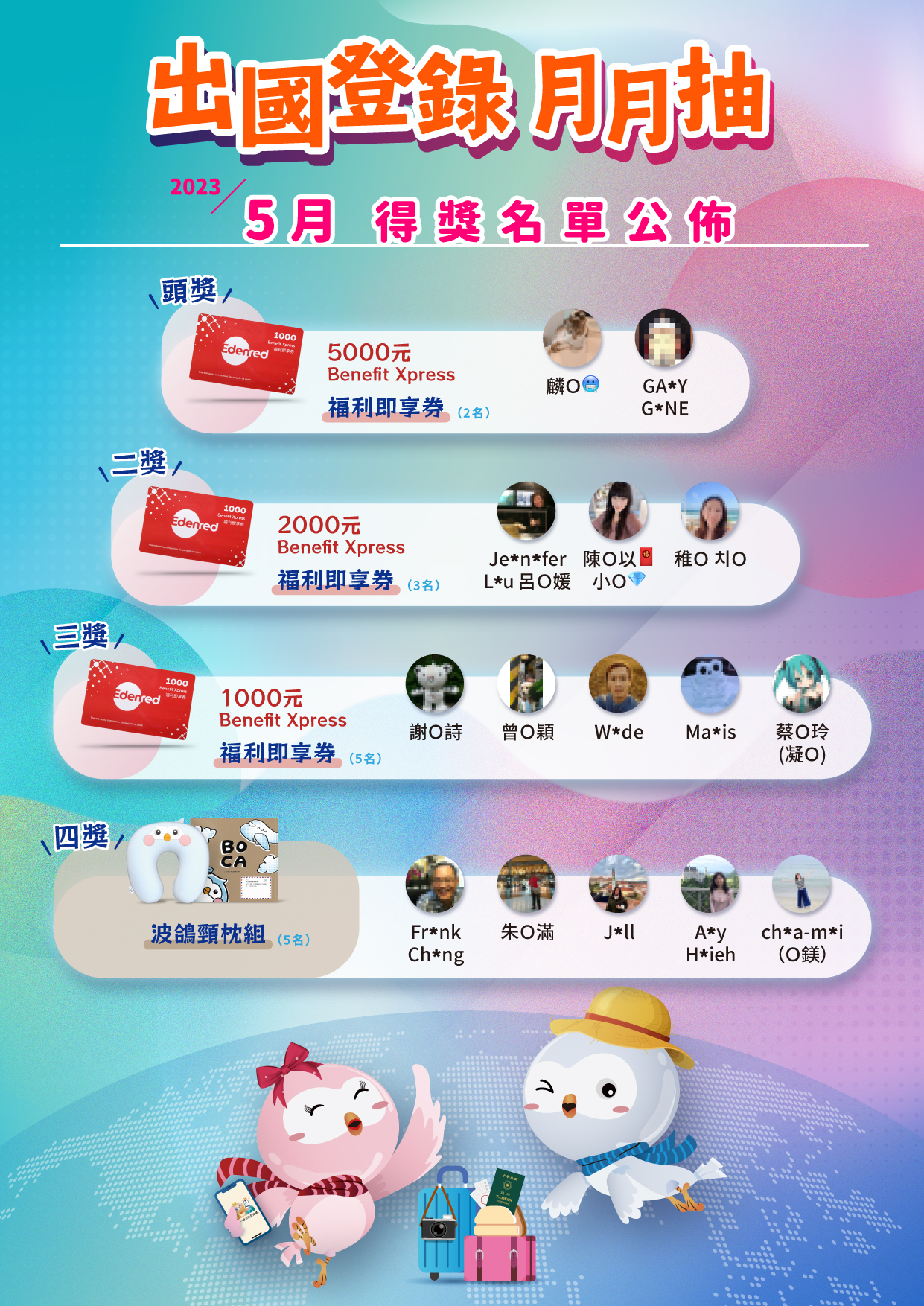 外交部領事事務局「出國登錄月月抽」抽獎活動112年5月得獎名單
