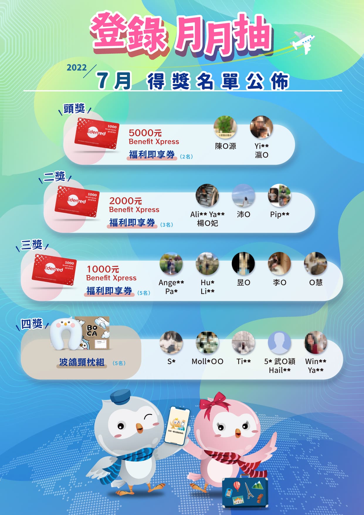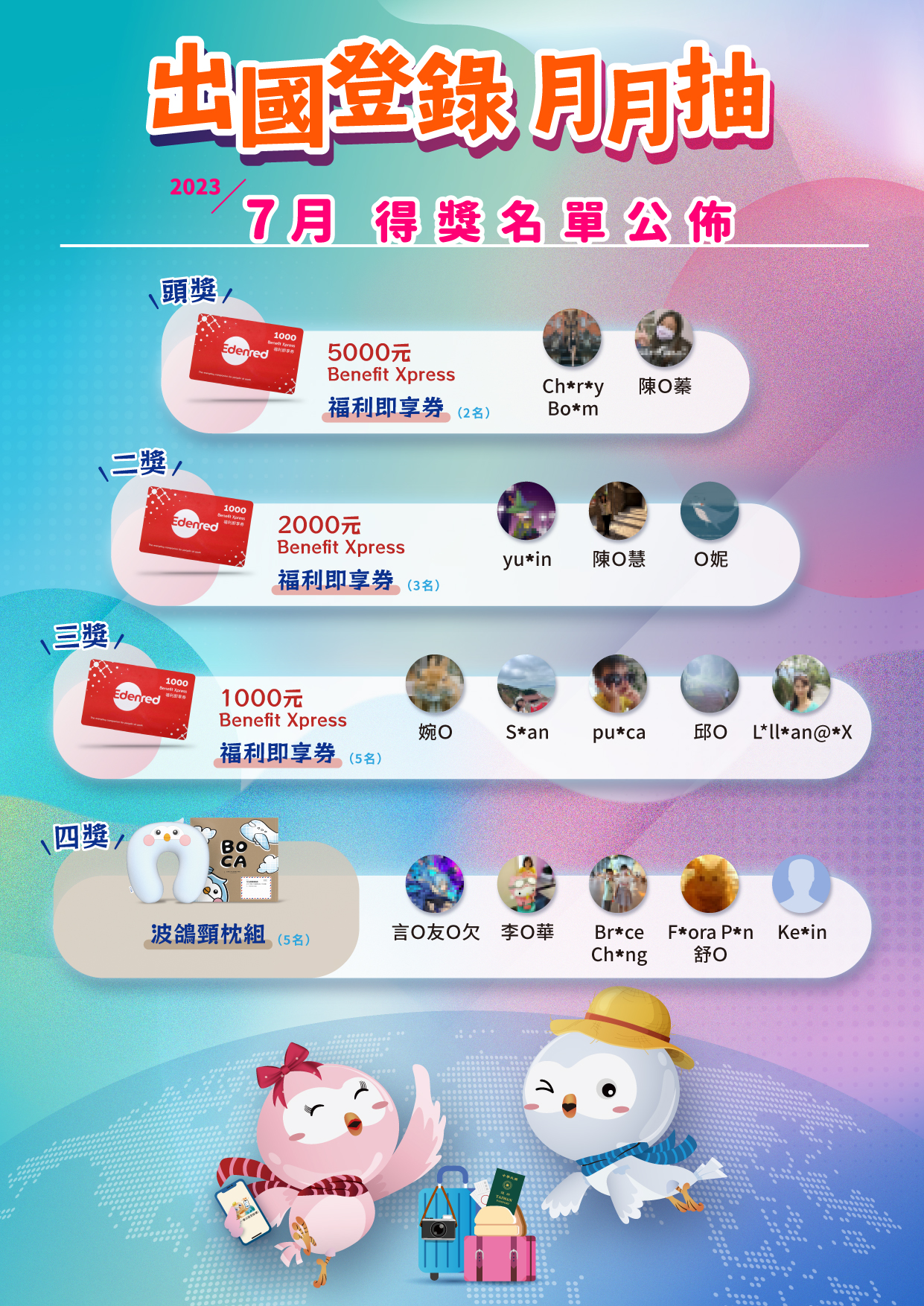 外交部領事事務局「出國登錄月月抽」抽獎活動112年7月得獎名單