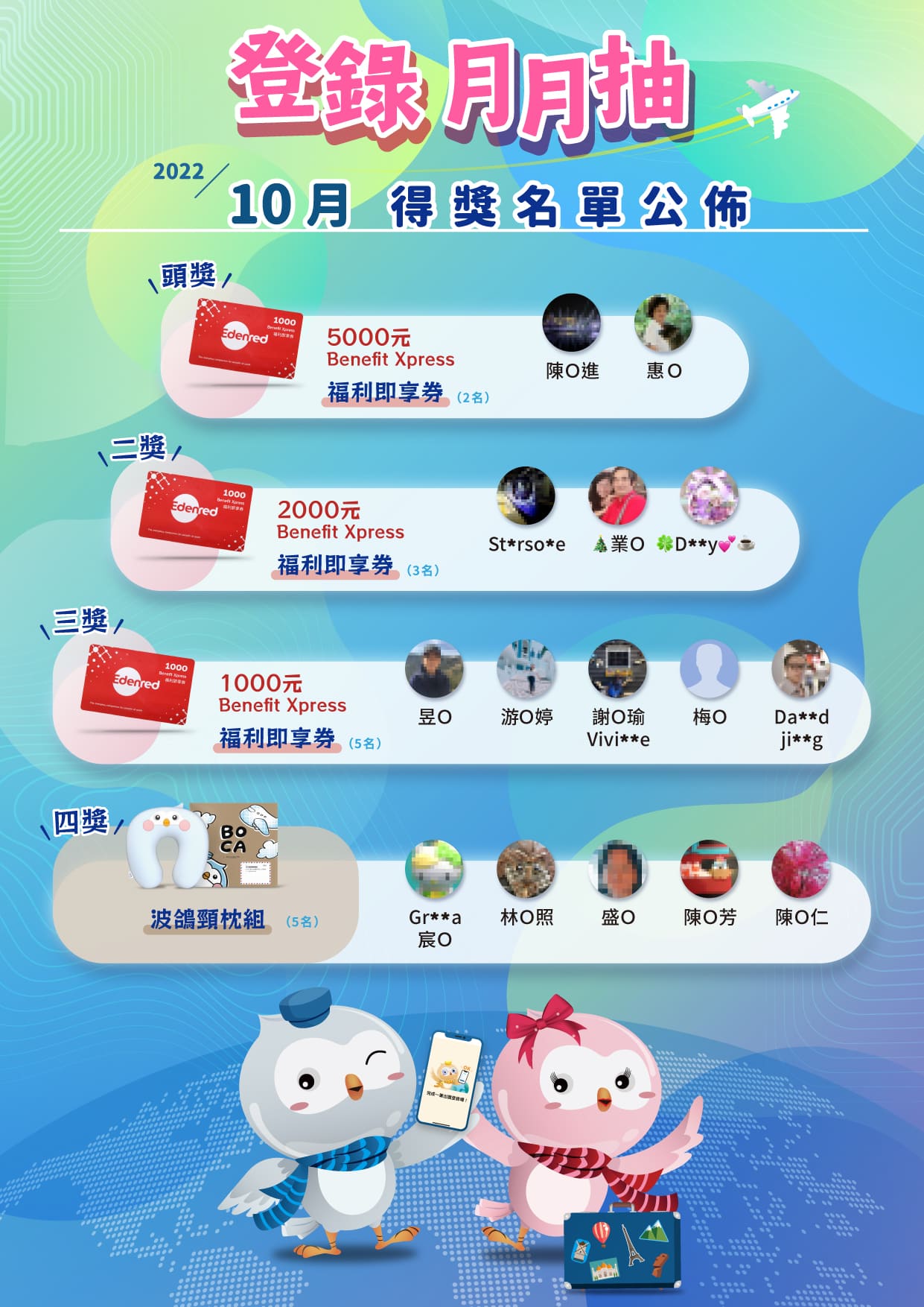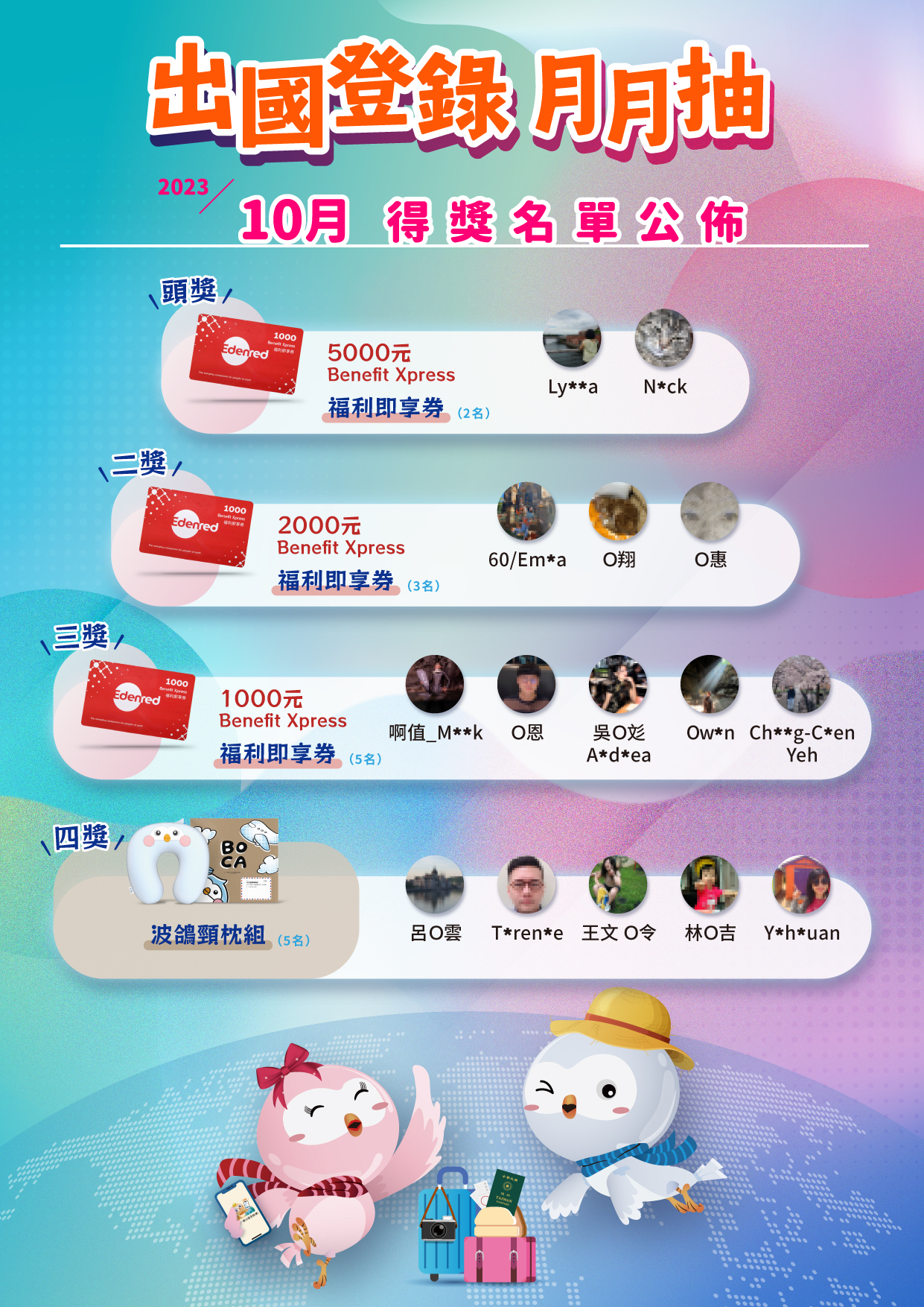 外交部領事事務局「出國登錄月月抽」抽獎活動112年10月得獎名單