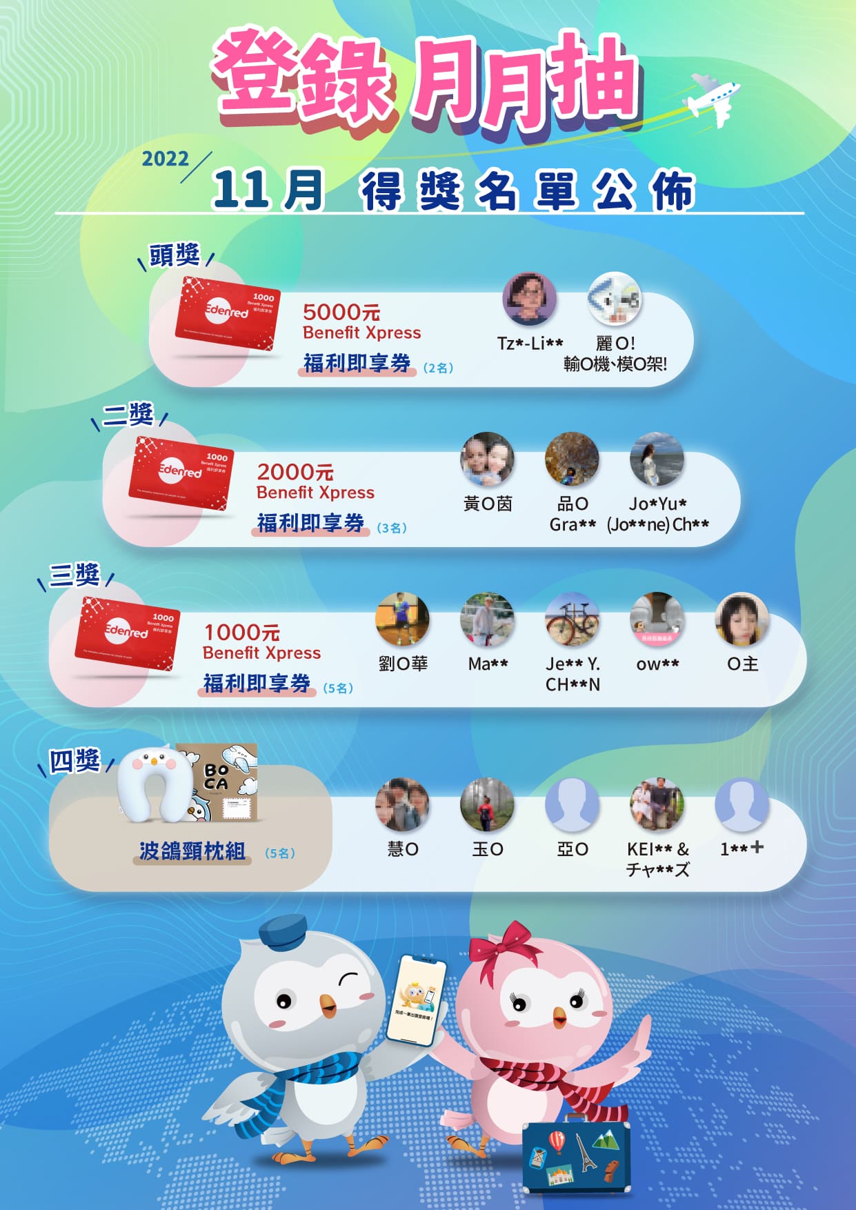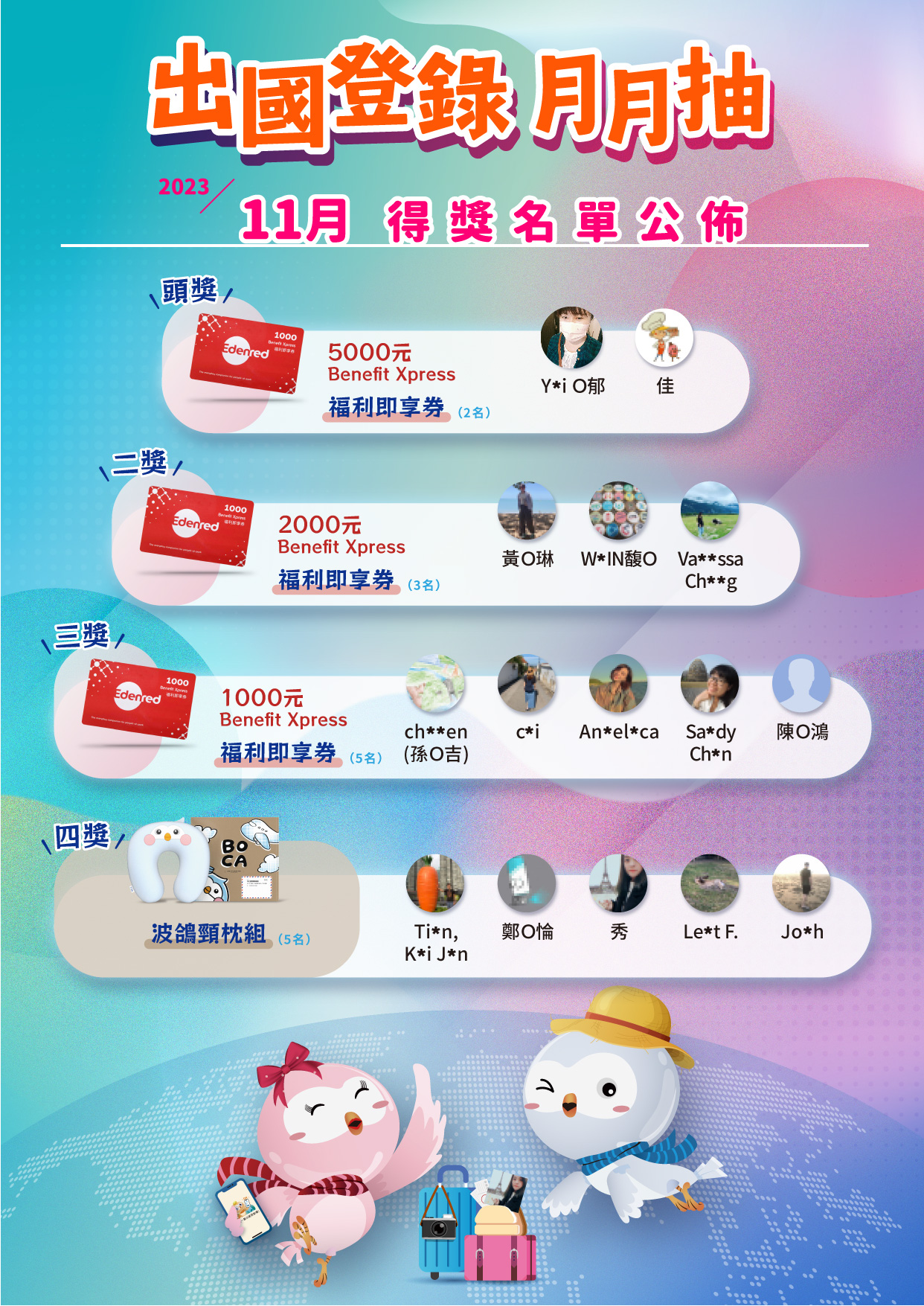 外交部領事事務局「出國登錄月月抽」抽獎活動112年11月得獎名單