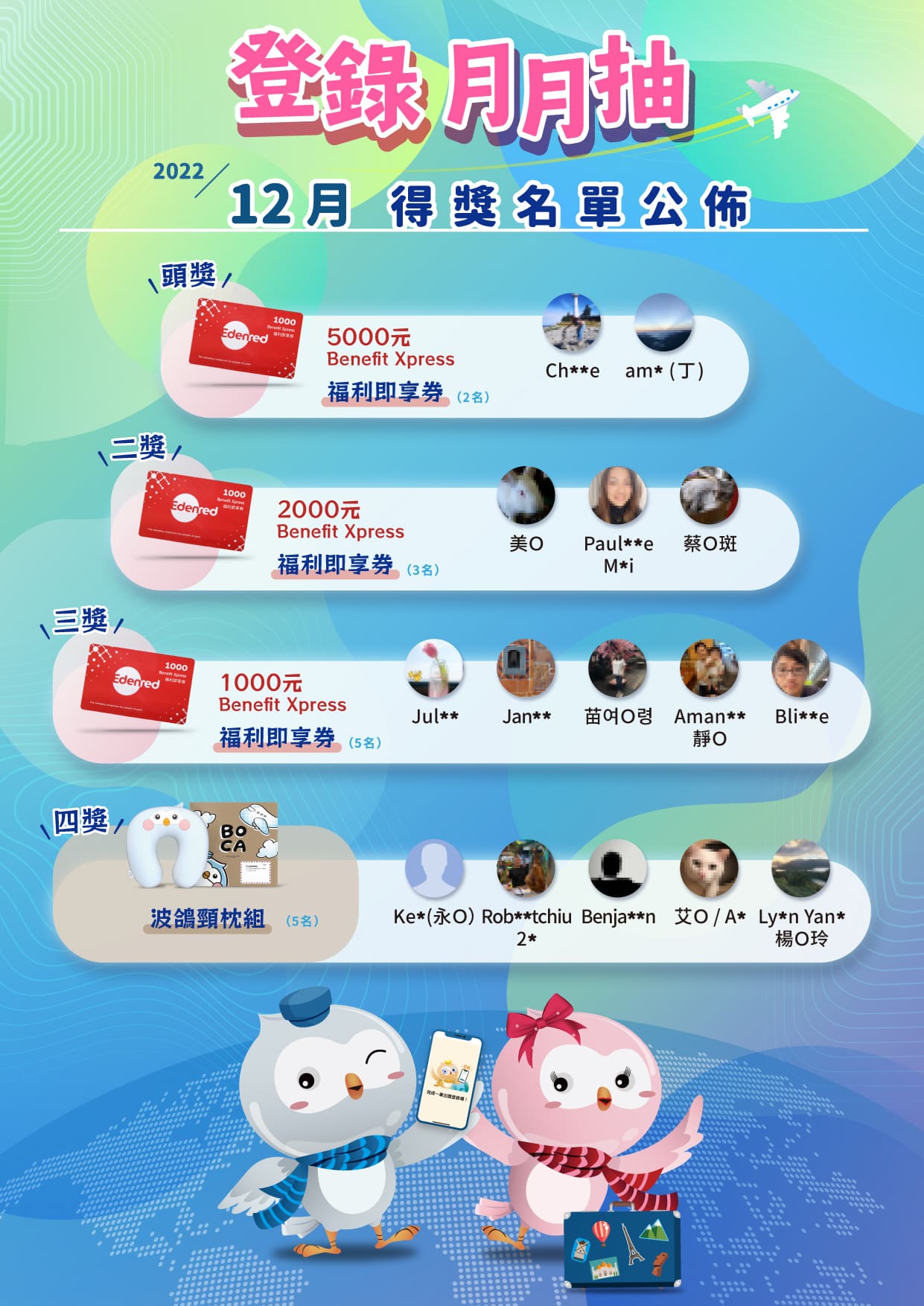 外交部領事事務局「出國登錄月月抽」抽獎活動111年12月得獎名單
