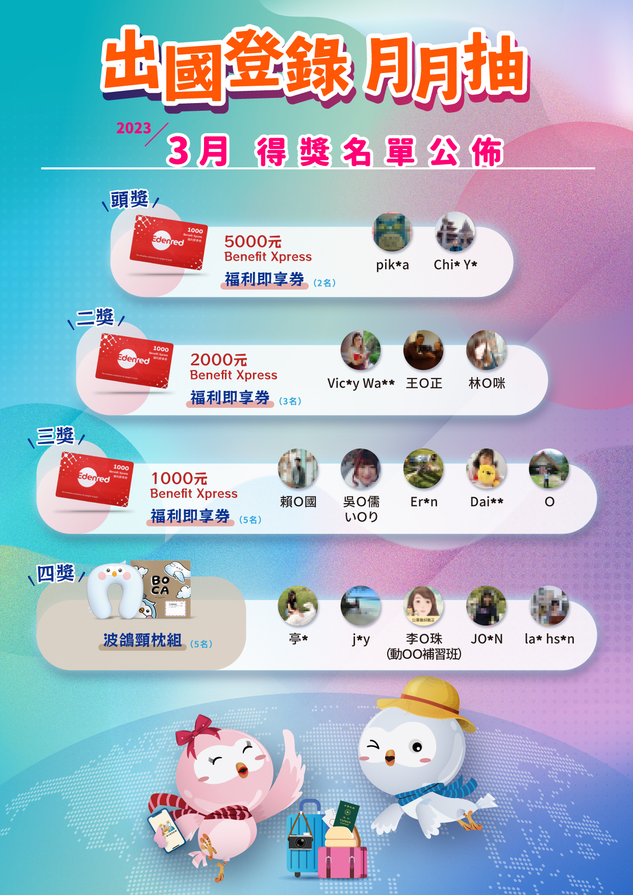 外交部領事事務局「出國登錄月月抽」抽獎活動112年3月得獎名單