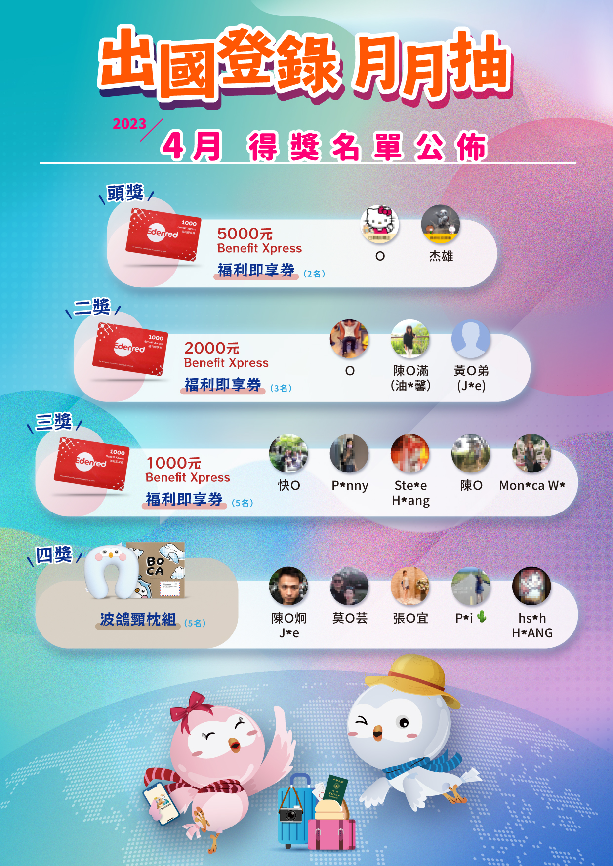 外交部領事事務局「出國登錄月月抽」抽獎活動112年4月得獎名單
