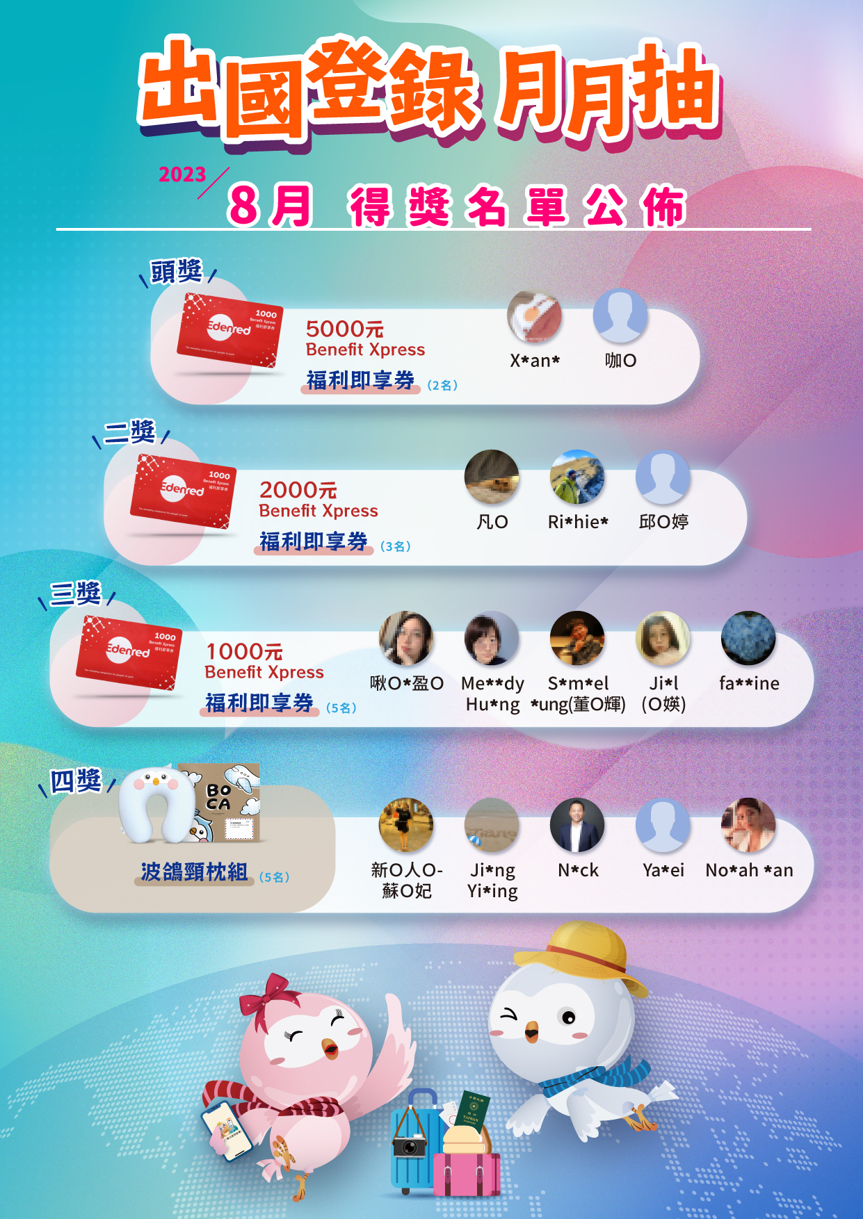 外交部領事事務局「出國登錄月月抽」抽獎活動112年8月得獎名單