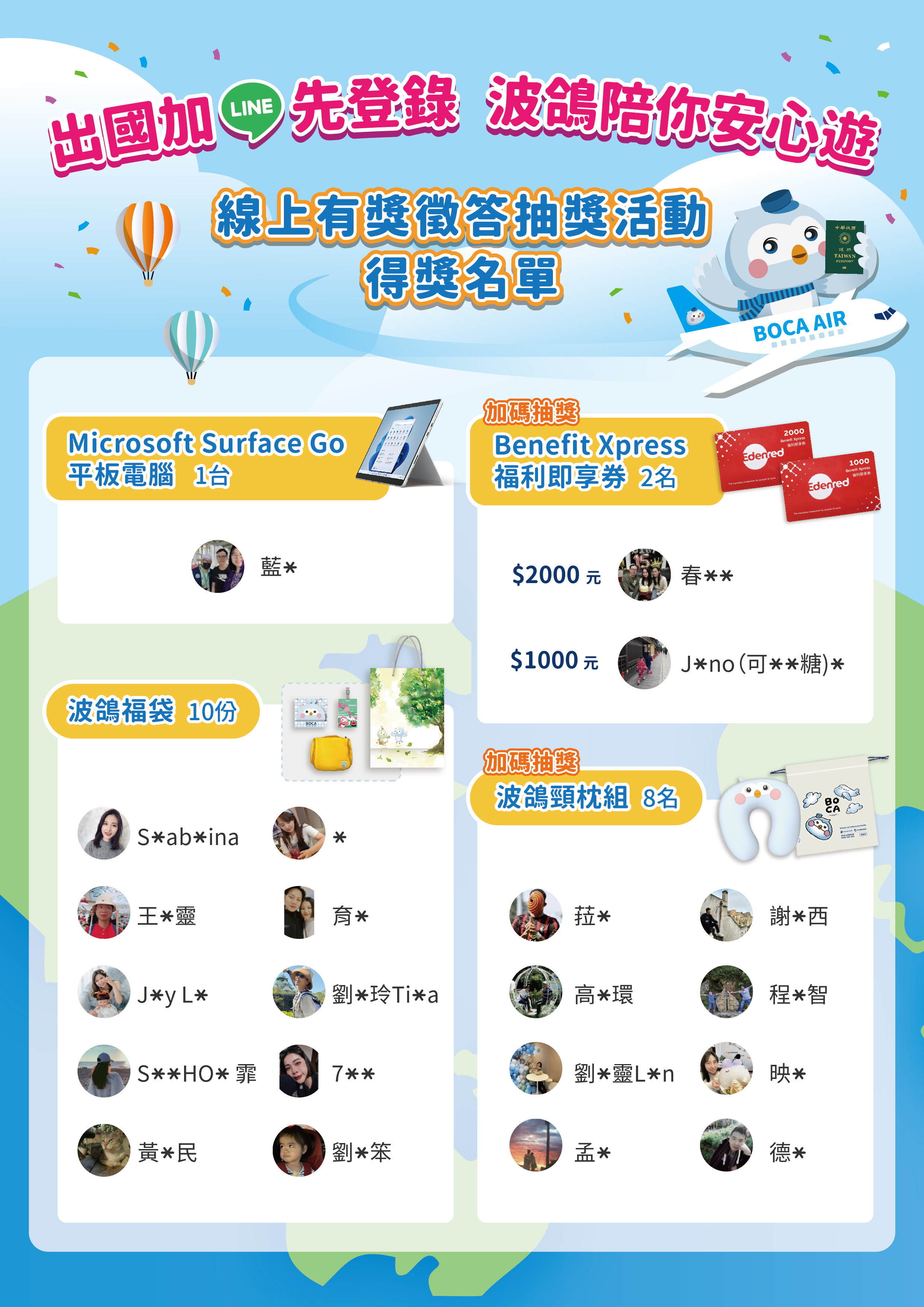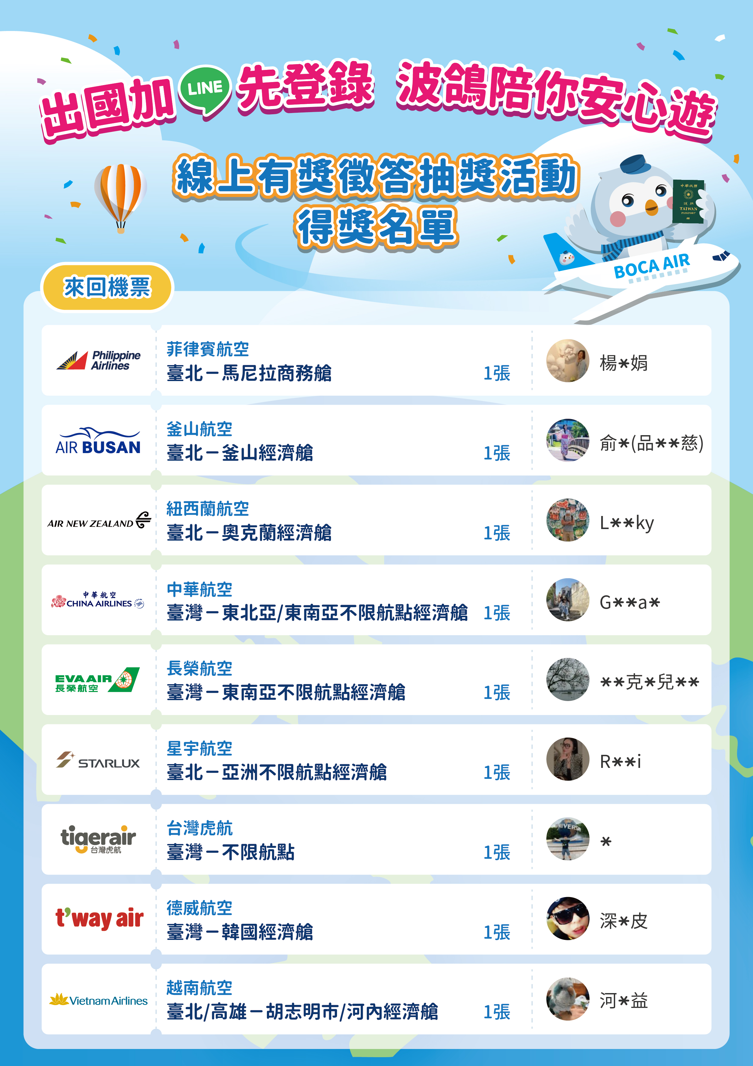 感謝大家踴躍參與外交部領事事務局LINE官方帳號本(113)年5月28日至6月2日舉辦【出國加LINE先登錄,波鴿陪你安心遊】線上旅外安全宣導有獎徵答暨下載「旅外安全指南APP」加碼抽獎活動,本局已於6月3日上午11時於「2024台北國際觀光博覽會」大會舞台,邀請贊助本活動的各家航空公司代表公布機票獎項抽獎結果,本活動各獎項得獎名單請詳附件。請持續關注本局LINE官方帳號,即時接收最新旅安資訊及活動消息。