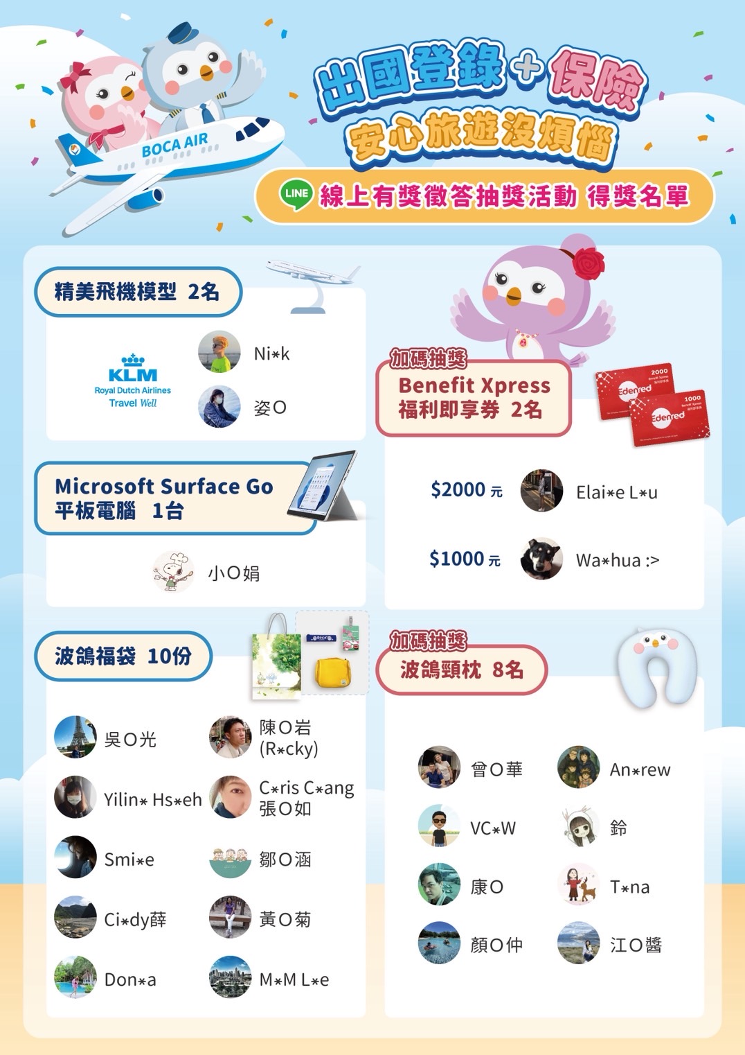 8.除機票獎項外,其餘金額超過新台幣1,000元以上之得獎者(如:Microsoft Surface Go平板電腦及Benefit Xpress福利即享券),須另填寫相關領據資料並於期限內回傳,以利後續活動小組寄送禮品事宜。