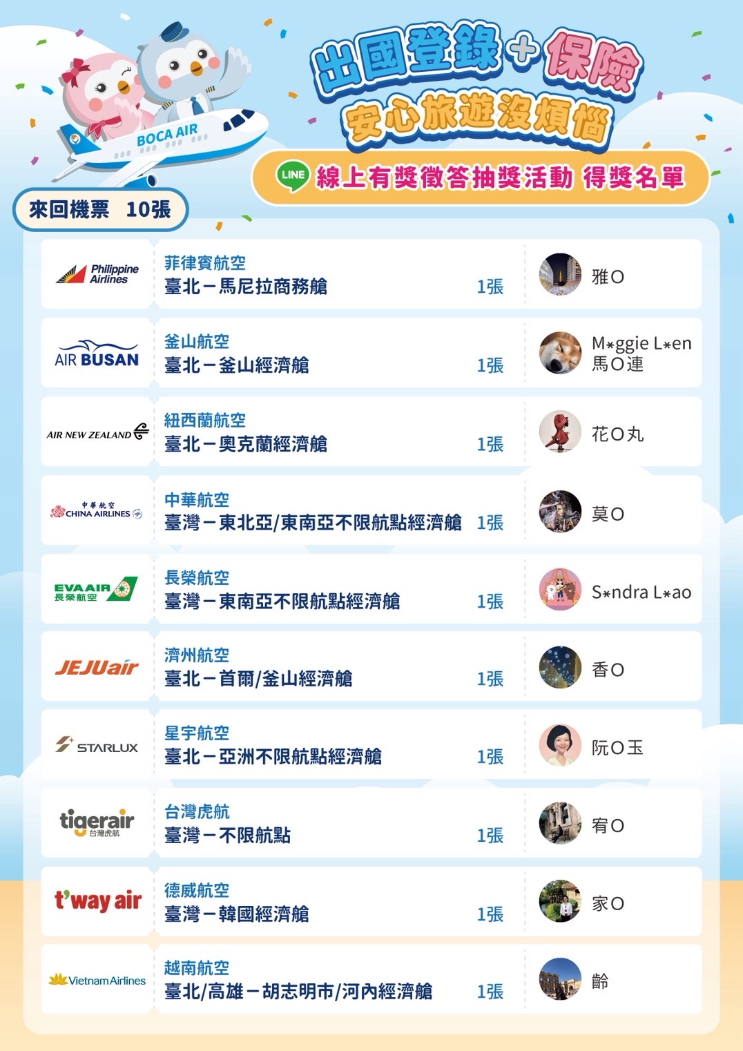 感謝大家踴躍參與外交部領事事務局LINE官方帳號本(114)年5月20日至25日舉辦【出國登錄+保險,安心旅遊沒煩惱】線上旅外安全宣導有獎徵答活動,本局已於5月26日上午11時於「2025台北國際觀光博覽會」大會舞台,邀請贊助本活動的各家航空公司代表公布機票獎項抽獎結果,本活動各獎項得獎名單請詳附件。請持續關注本局LINE官方帳號,即時接收最新旅安資訊及活動消息。