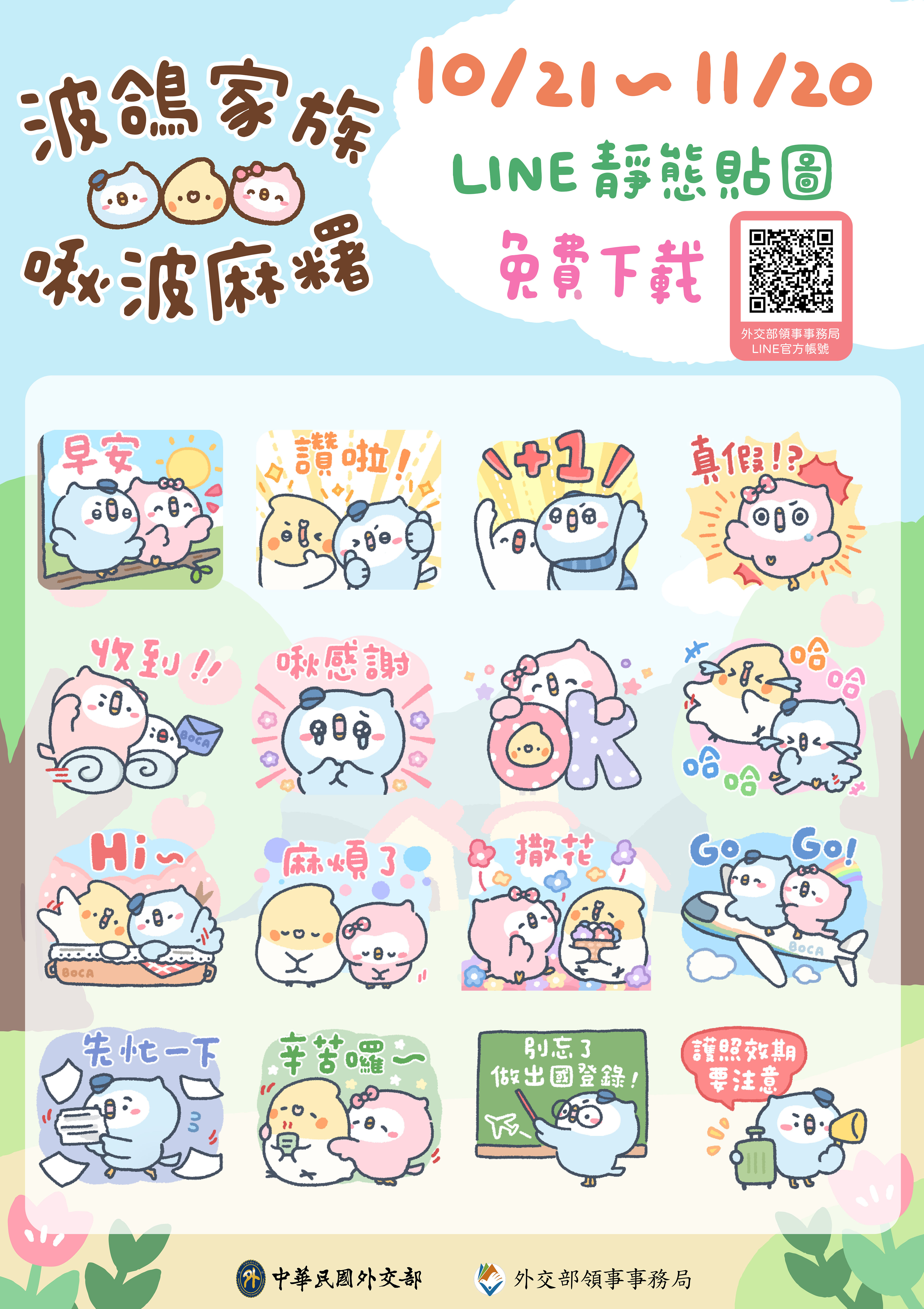 外交部領事事務局LINE官方帳號「波鴿家族x啾波麻糬」貼圖免費下載及人氣票選抽獎活動,歡迎踴躍參加!