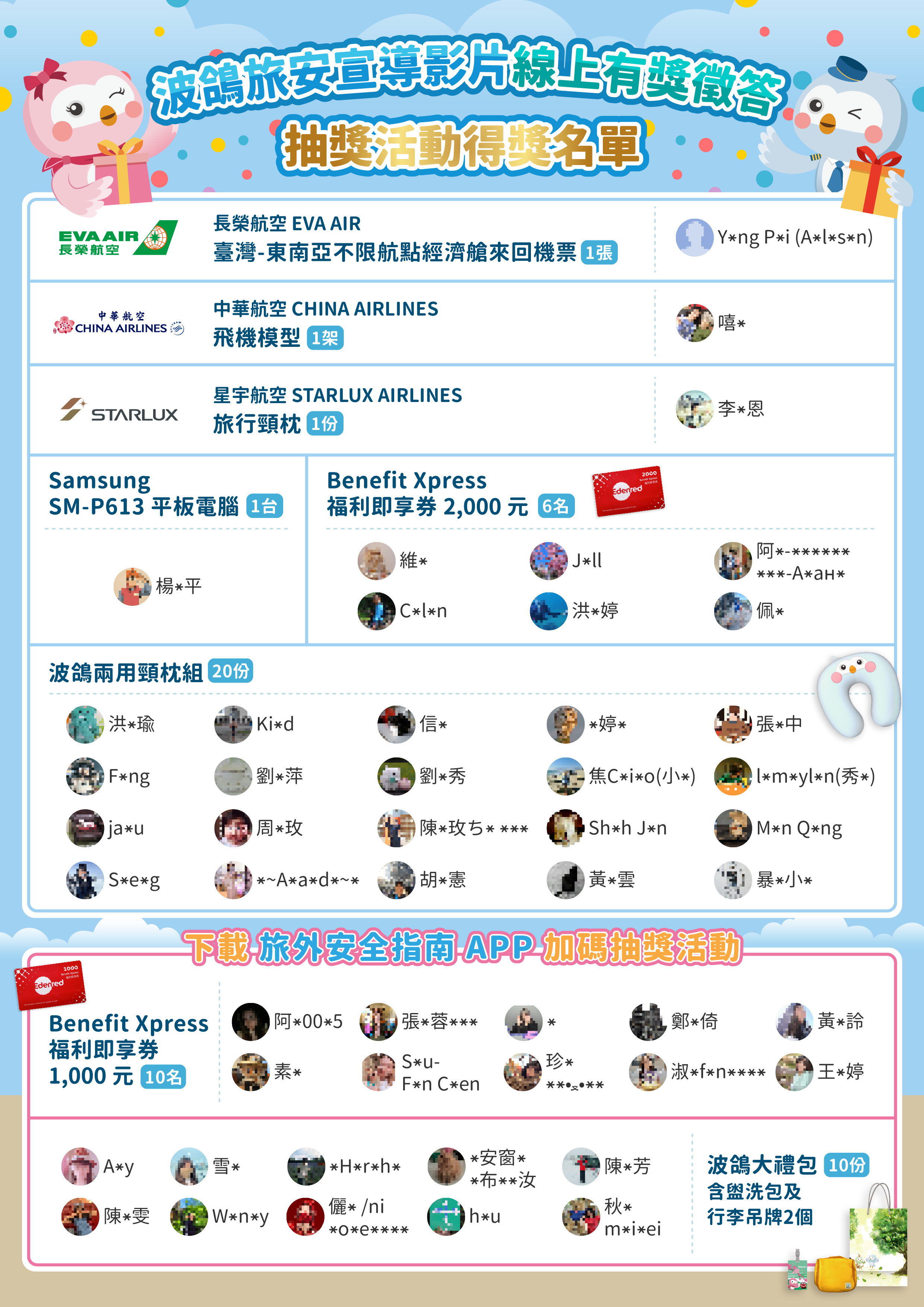 外交部領事事務局【波鴿旅外安全宣導影片】線上有獎徵答抽獎活動得獎名單