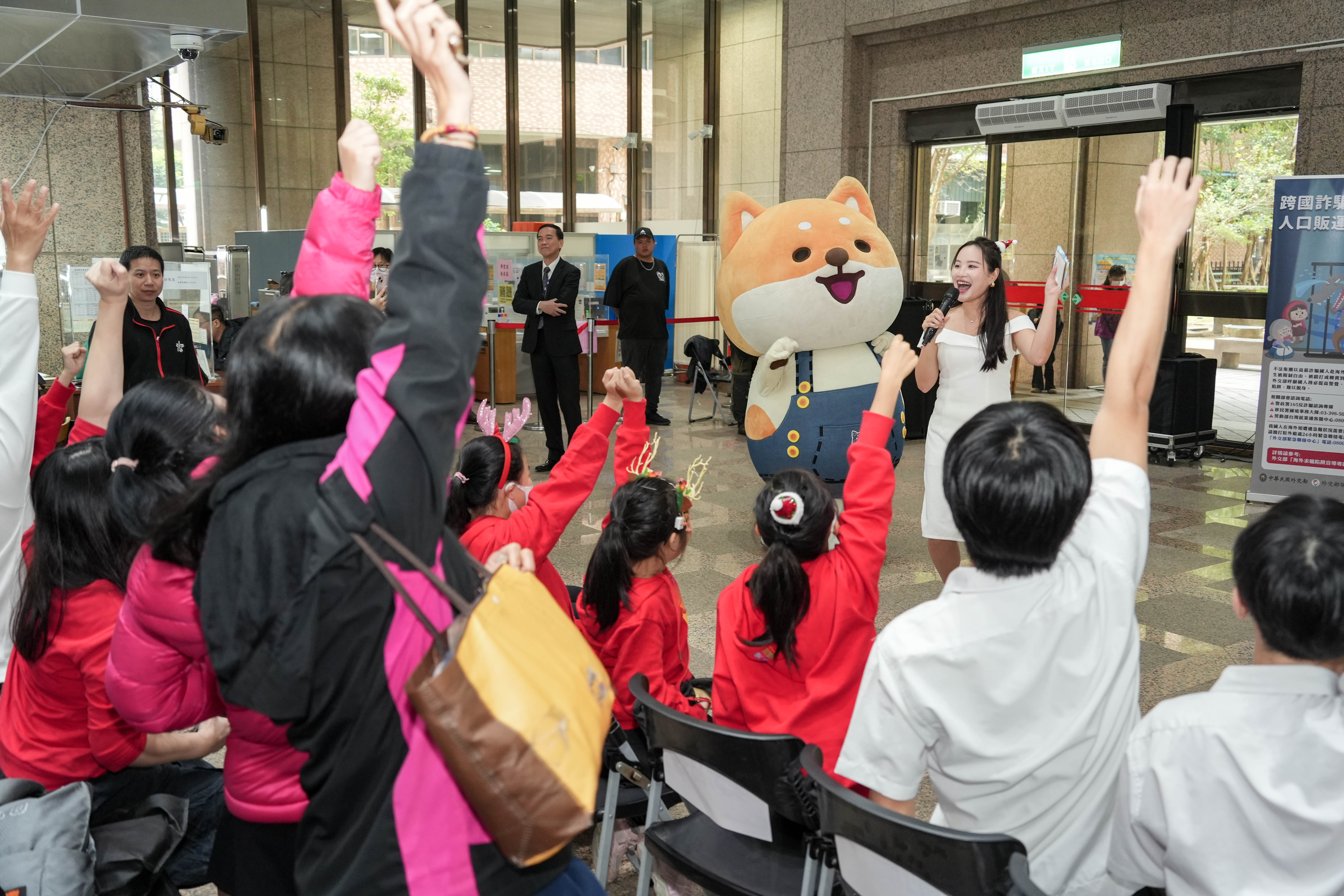 現場精心安排領務局及刑事局吉祥物波鴿、波妹及刑事Bear及好友柴犬與民眾相見歡、東門國小管樂團耶誕樂曲演奏,領務局防制海外求職詐騙的旅安動畫影片與場面熱烈的有獎徵答節目,以及刑事局莊科長的案例宣介及經驗分享,另有數十名開南中學師生一同參與宣導,期許防制海外求職詐騙意識能向下扎根。