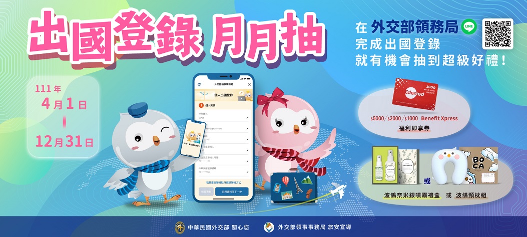 - 2023-04-20外交部領事事務局LINE官方帳號「出國登錄月月抽」抽獎活動得獎名單
